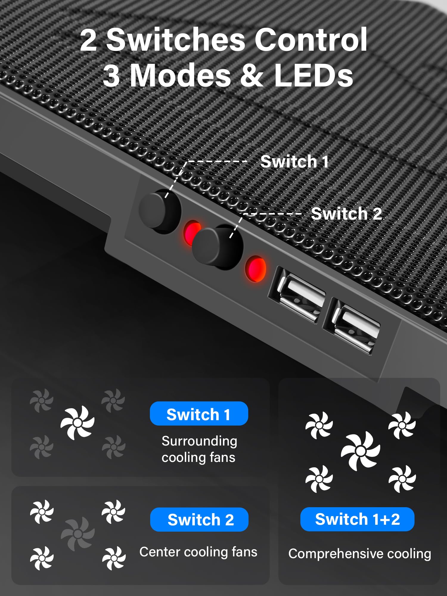 - Enhanced Cooling Performance: The laptop cooling pad features 5 built-in fans (big fan: 4.72-inch, small fans: 2.76-inch), all with blue LEDs. 2 On/Off switches enable simultaneous control of all 5 fans and LEDs. Simply press the switch to select 1 fan working, 4 fans working, or all 5 working together.